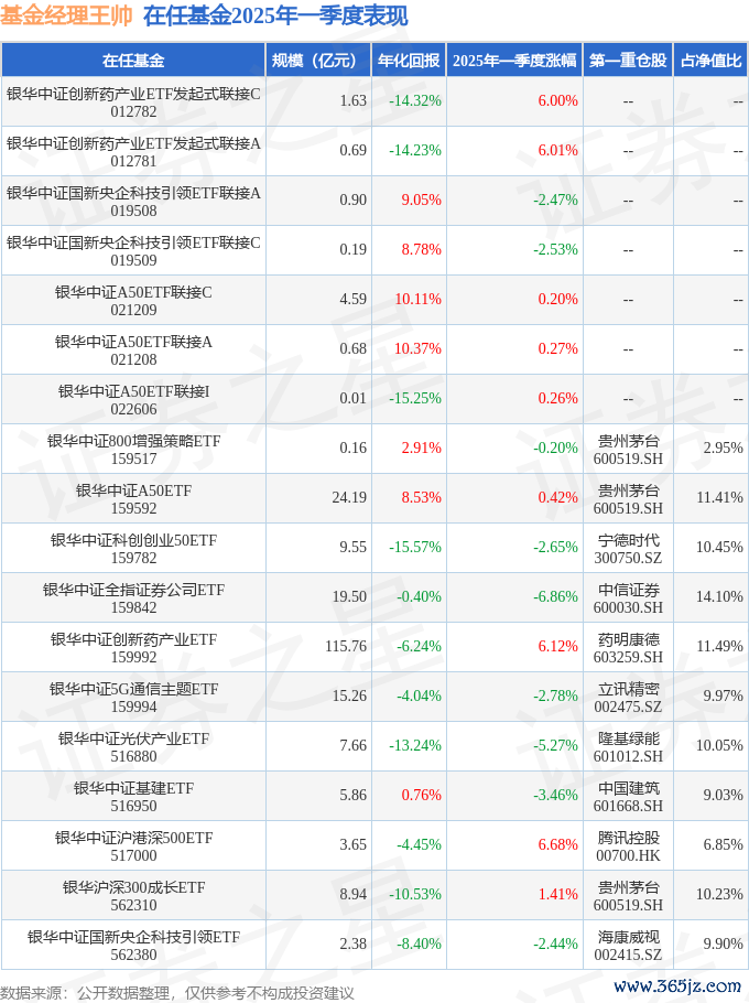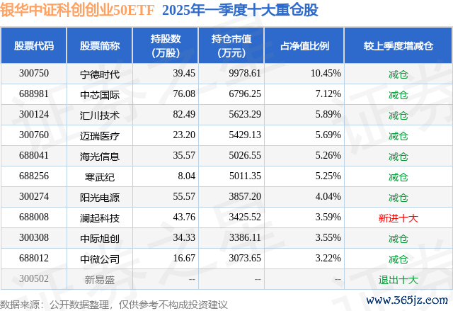 从基金规模来看,银华中证科创创业50ETF基金2025年一季度公布的基金规模为9.55亿元金鼎配资 ,较上一期规模11.51亿元变化了-1.96亿元,环比变化了-17.02%。该基金最新一期资产配置为:股票占净值比98.22%,无债券类资产,现金占净值比1.9%。从基金持仓来看,该基金当季前十大股票仓位达54.06%,第一大重仓股为宁德时代(300750),持仓占比为10.45%。