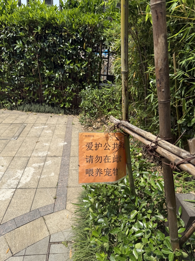 4月23日,记者赶往现场了解情况。该小区位于松江区九亭镇伴亭路上,西侧是别墅区域,东侧为高层住宅,绿化面积不小。根据居民描述的投放点位,记者在小区里转了好几圈,也没能在公共绿化带上找到所谓的智能猫屋。不过,小区西北角的绿化丛中,有一张橙色的告示格外醒目,上面写着:“爱护公共环境,请勿在此处喂养宠物。”